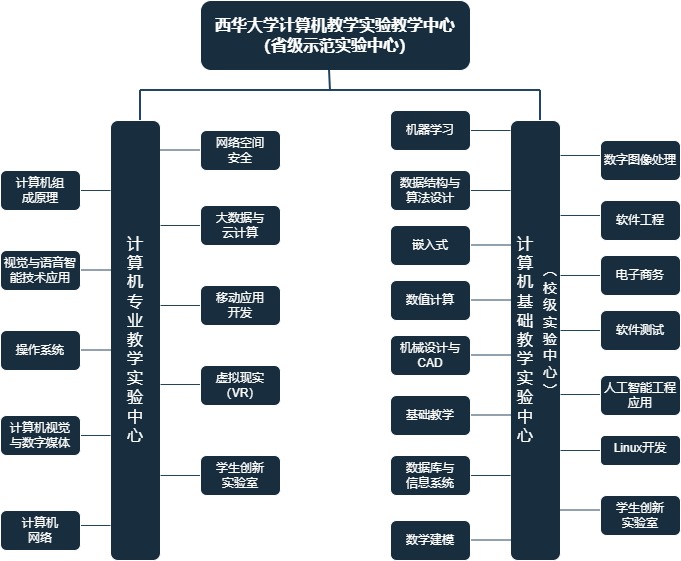 西华大学计算机教学实验教学中心(省级示范中心)由西华大学、计算机与软件工程学院校院两级管理,实行主任负责制,设主任1名,负责制定中心建设规划与运行机制,并监督实施。下设1个计算机基础教学实验中心(校级实验中心)、1个计算机专业教学实验中心,师资由专任教师和实验教师组成。中心下设本科教学指导委员会,对实验室建设、实验教学、实验室安全进行指导和督察。